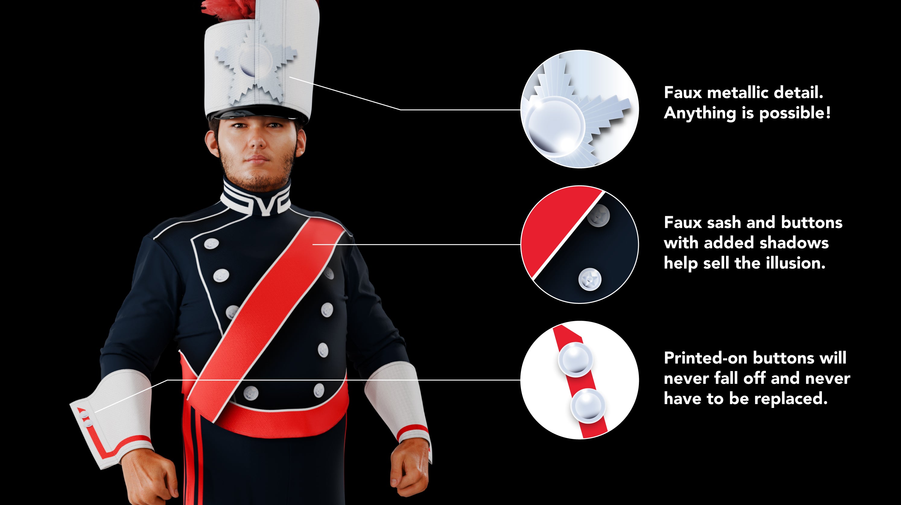 Now you can get authentic uniform details without the hassle. McCormick's uniforms are machine-washable, using ordinary machines at home. With ForeverColor™ technology, colors won't fade, crack, or peel. From the stands, our buttons, sashes, and epaulets are indistinguishable from the ones that are sewn on, and never have to be replaced.