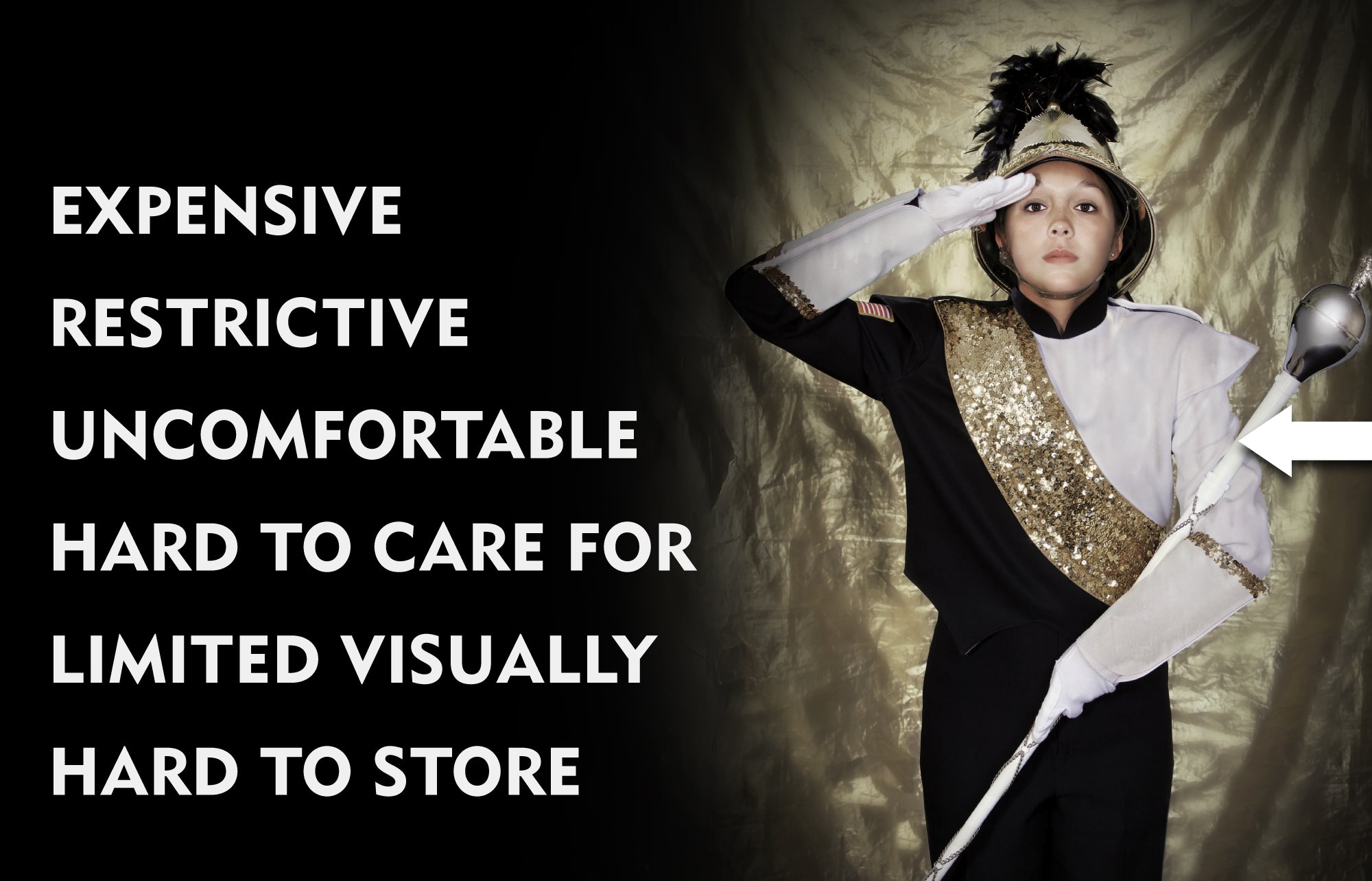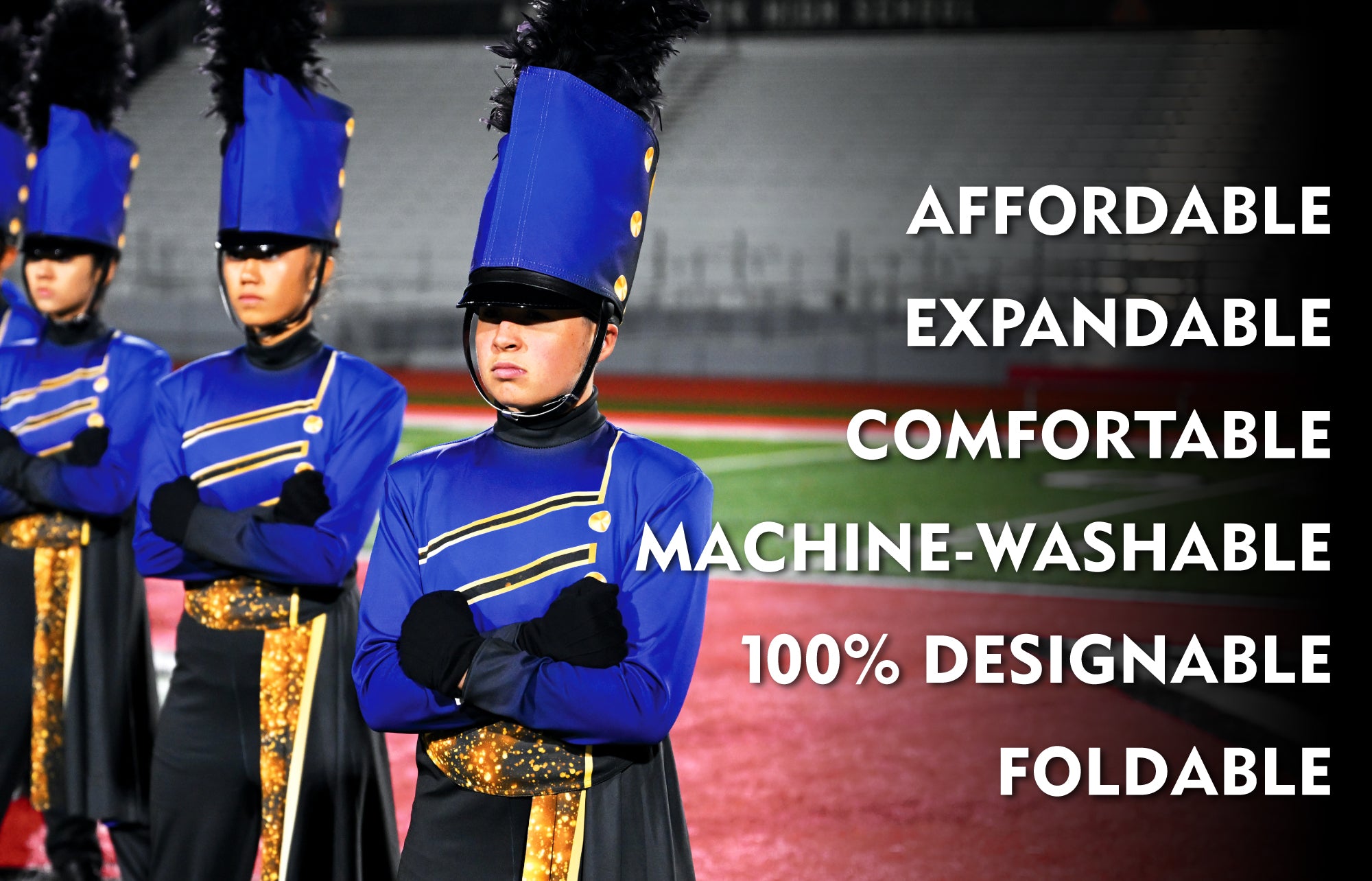 Fabric-on-fabric band uniforms are hard to care for. They need to be dry-cleaned and kept safe to prevent permanent damage. Over time, buttons fall off, sashes tear, and colors fade. Maintaining all of this comes at a significant extra expense.